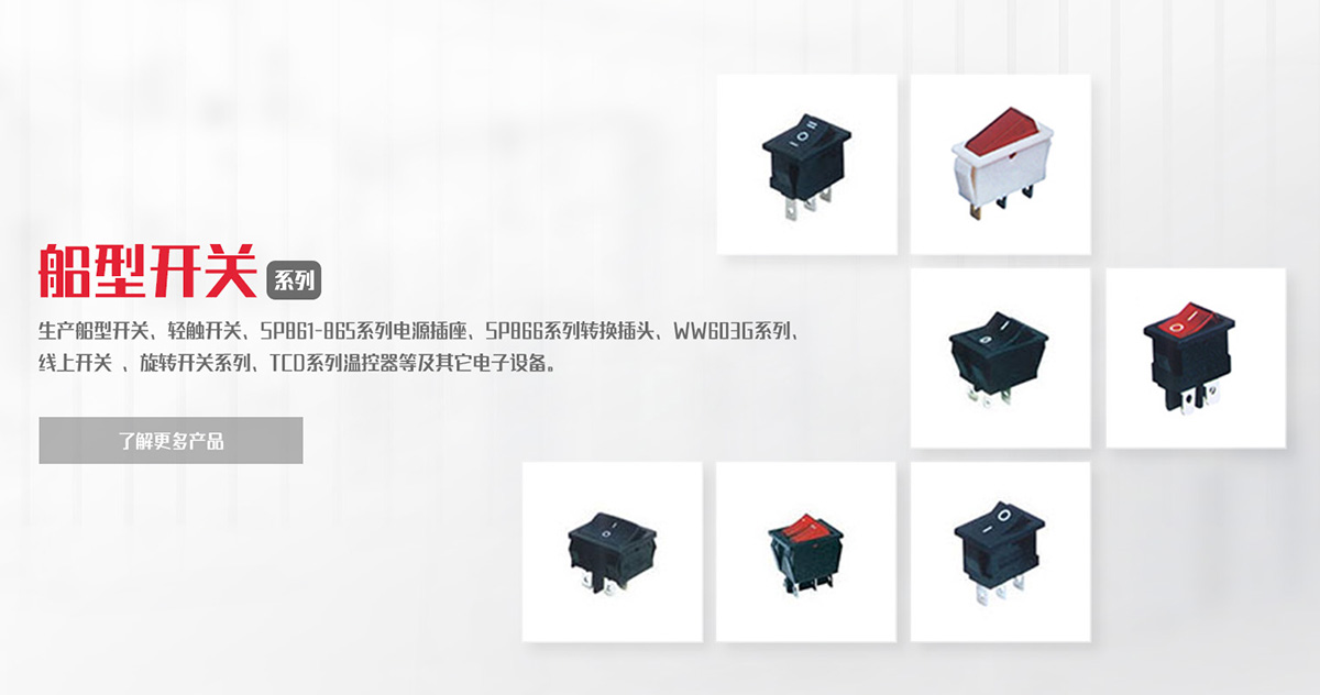 致力于船型開關(guān)、負載開關(guān)、輕觸開關(guān)、微動開關(guān)等產(chǎn)品的研發(fā)、制造、銷售。